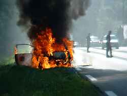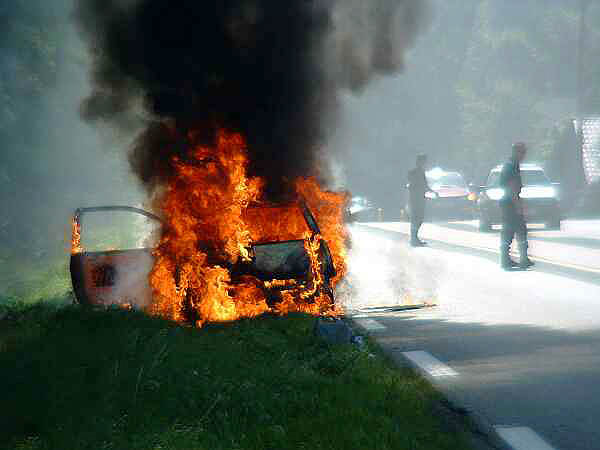 Kurz vor Apach ( Letztes Dorf in Frankreich) sahen wir dicke Rauchwolken emporsteigen. Als wir vorbei fuhren sahen wir, das ein Auto Feuer gefangen hatte und lichterloh brannte.