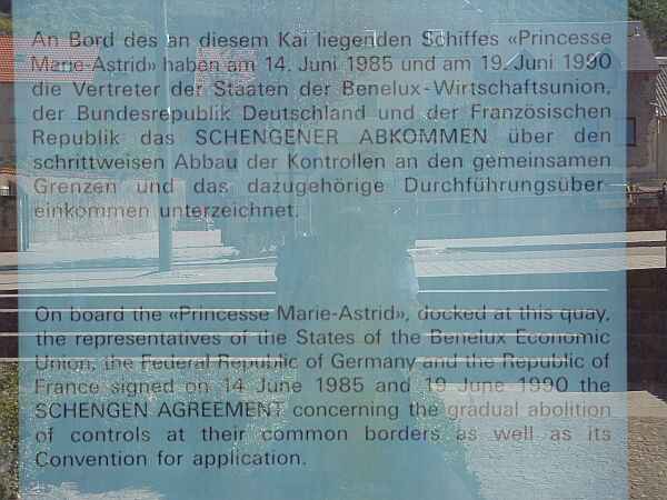 Nach der Grenze (heute nur noch zu sehen durch Beschriftungen in deutscher Sprache) geht es links über die Brücke und man ist im Dorf das heute in der Schweiz das Gesprächsthema ist „Schengen“. Hier wurde am 14.06.1985 das 1.Schengener Abkommen unterzeichnet. Es sah vor, ein Abkommen zwischen den Benelux Staaten, Deutschland und Frankreich auf Personen, Wahren und Fahrzeugkontrollen an den gemeinsamen Grenzen zu verzichten. (Trat aber erst, wegen Durchführungsschwierigkeiten am 26.03.1995 endgültig in Kraft.) Schengen 2 beinhaltet: Zur Gewährleistung der inneren Sicherheit gemeinsame Einreisevorschriften, verstärkte Kontrollen für die Aussengrenze, Regeln für die Prüfung von Asylbewerbern, einen Ausbau der Grenzüberschreitenden Polizeiliche Zusammenarbeit, Vereinheitlichung des Betäubungsmittel- und Waffenrechts.