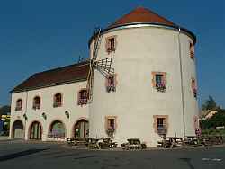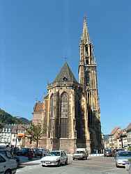 Het ontbijt is mager, het bestaat uit fruit van gisteren;op zondagmorgen is alles gesloten. We rijden om de zuidkant om Mulhouse heen via Aspach naar Thann. Daar aangekomen is de dag al zo ver om, dat de restaurants open zijn. We nemen plaats op een terrasje met een mooi uitzicht op de kerk en kunnen de de schade inhalen. Than is wel een van de mooiste stadjes in de Elzas waar je, vooral in de asperge-tijd, graag heen gaat. Jammer genoeg is er nog geen auto-loos voetgangersgebied.