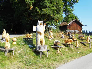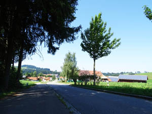 Mein Velo-GPS führt mich durch den Westallgäu via Niederstaufen, Heimkirchen zum Simmerberg. Hier biege ich nach Osten ab über die Landstrasse via Genhofen und Kalzhofen (L14). So umgehe ich die Schnellstrasse via Oberreute und Oberstaufen. Jetzt sehe ich zum ersten Mal die offizielle Deutsche Alpenstrasse aber vom Radweg aus. Ich höre von weitem wie die Autos vorbei sausen. Ich bleibe auf dem Radweg der nördlich des Alpsees nach Immenstadt führt. Es wimmelt nur so von badenden Menschen entlang des Sees.