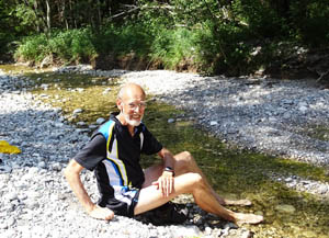 Nach 25 Km. wird die Isar zum Sylvensteinsee aufgestaut. Beim Staudamm geht es rechts zum Achenpass (940M.) Auf dem Weg zum Achenpass komme ich an einem kleinen Bach vorbei. Der ideale Platz zum Mittagessen. Ich habe alles dabei für eine Mittagsmahlzeit, Alkoholfreies Bier inklusive. Ich such mir eine seichte Stelle damit ich meine Füsse während der Mahlzeit im Wasser abkühlen kann. Nach einem tollen Dessert geht die Steigung zum Achenpass los.