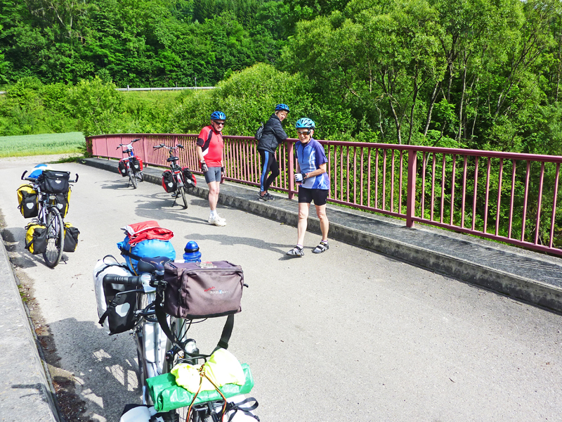 schwitzen. Auf einer kleinen Brücke stehen 2 Veloreisende mit denen wir ins Gespräch kommen. Es kommt
