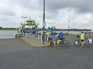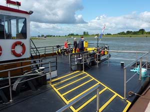 we voor de tweede rivier, met de voetgangerspont bij Wamel varen we over de Waal naar Tiel.