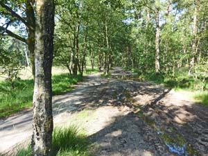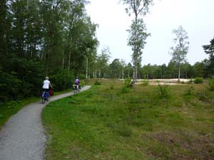 De zon doet al zijn best als we wegfietsen over fietspaden en door bos- en heidelandschap. We moeten oppassen,
