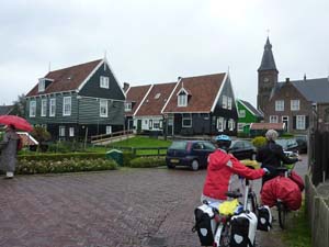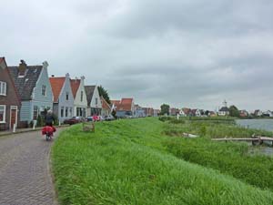 Over dijken met aan beide zijden water worden we met aanwakkerende rugwind naar het schiereiland Marken geblazen.