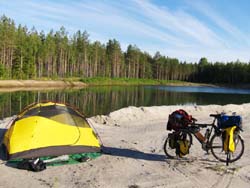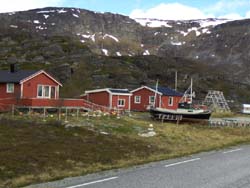 Einige Kilometer nach Alta geht es mit 7% hinauf auf ein Hochplateau von 250 Meter, die nächsten 80 Kilometer rauf und runter. Ab und zu fahre ich durch kleine Siedlungen, in einem von diesen gibt es einen kleinen Nahrungsmittelladen, die Gelegenheit für eine Zwischenverpflegung. Ich begegne Mitch, ein Norweger der seinen Rucksack auf einem Trolley vor sich hin schiebt. Am Nordkap startete er und wird sein Trolley in Alta umtauschen für Laufskien. Mit einem Freund wird er von Alta über die noch mit Schnee bedeckten Bergen nach dem südlichsten Punkt von Norwegen marschieren. Dafür hat er drei Monaten Frei genommen. In Skaidi bin ich wieder auf Meereshöhe und gönne mir ein Mittagessen. Kaufe anschliessend fürs Abendessen und das Frühstück von morgen ein. Jetzt beginnt das nächste Plateau. Die Vegetation ist karg, die einzigen Bäume sind Birken. Von Bäumen kann ich eigentlich nicht sprechen, sie sind mehr strauchartig. Jetzt kommt mir ein Gleichgesinnter Belgier entgegen. Er fährt auch ein Koga-Miyata-Randonneur aber mit einer anderen Legierung. Er ist von der Firma Koga gesponsert, deshalb hat er seine Reise auf zwei Websites.