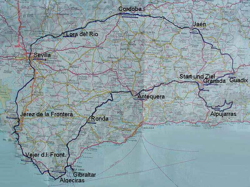 Landed on time at 12:25 at Granada Airport. Claimed bike and baggage which were not damaged. After refitting the pedals, adjusting the handlebars, pumping the tires and stowing away the baggage I headed towards town. Suddenly I was surrounded by plainclothes ground personnel who wanted to know where I was off to. I explained that I’d be starting my trip on Monday – Granada, Guadix, Jaen, Cordoba, Sevilla, Cadiz, Gibraltar, Ronda, Antequera, Granada – and if time allowed I would make an excursion in the Alpujarras.” And all that by bicycle?” was the question. “How old are you then?” “63, I replied” A quiet mumbling in Spanish – and because I didn’t understand what was said, I translated their words for myself to mean “He’s off his rocker”!! 16 km. To town centre where I had booked a room for three days.