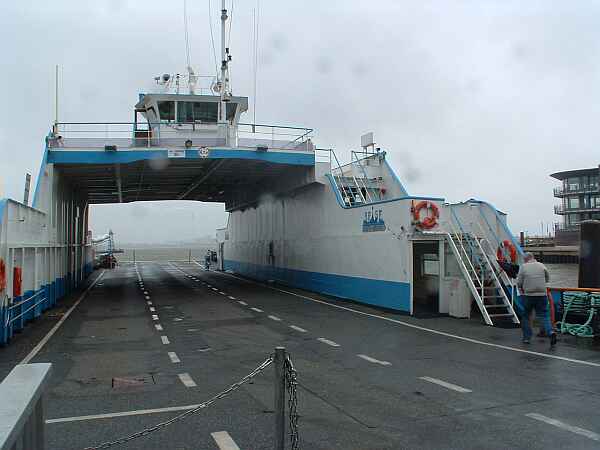 Langs Jade, Schweiburg am Wattenmeer richting Nordenham. Over de Weser gaat een pont. Wij zagen hem van achteren. Er zat niets anders op om op het volgende pontveer te wachten. Toen we het pont verlieten, begon het te regenen. Tot nu toe hadden we nog geen regen, regenkleding was echter steeds bij de handen klaar om aan te trekken. Gelukkig was er een wachthuisje waar we in alle rust onze pakken aan konden trekken.