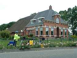 Waren het gisteren de molens, vandaag vielen de boerderijen ons op. Mens en dier leven hier onder een dak. Maar door verschil in dakbedekking kun je goed zien dat voor de mensen huizen en achter de dieren.