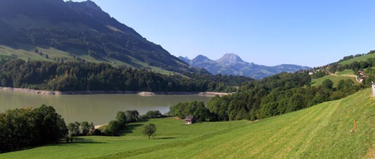 Von der Brücke über dem Sihlsee <Viele Pässe sind mit Km. und Höhenmeter angegeben |