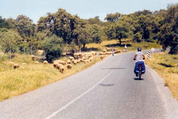 A beautiful country with red earth, grape vines and olive trees as far as you can see, then again cork oaks. It is a paradise for the grey-black pigs, roaming around, searching for acorns. They later become the desired, air-dried Iberien ham. Likewise we met bulls, which are breeded for other purposes. A beautiful free life, apart from the last 20 minutes, during which they have to meet the bullfighter in an arena.